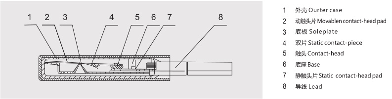 件處于自由狀態(tài),動(dòng)觸頭與靜觸片閉合,電路導(dǎo)通。當(dāng)使用電器因故發(fā)熱,溫度上升到該產(chǎn)品額定動(dòng)作溫度值時(shí),雙金 屬 元 件